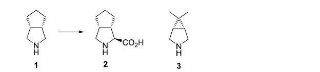 The Vertex process chemistry to produce Telaprevir involves as a key step the chemical desymmetrization of the meso intermediate 1, to produce 2 or a synthetic equivalent. An analogous approach towards the synthesis of Boceprevir occurs via intermediate 3.