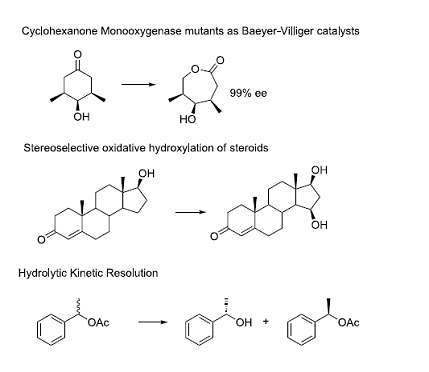 The research group headed by Manfred T. Reetz has been very active in development of new enzymes for key organic transformations. They have developed methodology and protocols to address the numbers problem in directed evolution. The use of protein structure plays a significant role in library design, especially in identifying pairs of residues to be mutated simultaneously. In their research they have discovered new enzymes for important transformations. A select few are illustrated below: