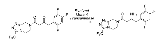 In an elegant study, an efficient biocatalytic process was developed, to replace a rhodium-catalyzed asymmetric enamine hydrogenation, for the large-scale manufacture of the antidiabetic compound sitagliptin. The starting point was an enzyme that had the catalytic machinery to perform the desired chemistry but lacked any activity toward the prositagliptin substrate ketone. Initial studies used protein structure and computational model building of an enzyme-substrate complex to design initial mutant proteins. A transaminase enzyme with marginal activity for the synthesis of the appropriate chiral amine was discovered. This mutant enzyme was then further engineered via several rounds of directed evolution for practical application in a manufacturing setting. The resultant biocatalysts showed broad applicability toward the synthesis of chiral amines that previously were accessible only via resolution. This work underscores the maturation of biocatalysis to enable efficient, economical, and environmentally benign processes for the manufacture of pharmaceuticals.