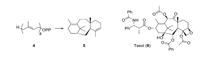 The terpenoid cyclase class of enzymes catalyze reactions that can create highly complex organic compounds from simple acyclic starting materials. The enzyme taxadiene synthase converts the acyclic geranylgeranyl pyrophosphate (4) into the complex tricyclic hydrocarbon taxadiene (5) in a single step! Taxadiene is the biosynthetic precursor for the antitumor agent taxol (6); the types of oxidative enzymes involved in the conversion of 5 into 6 are also fascinating and are of potential value in biocatalyst. The terpenoid cyclase class of enzymes has been well studied from a mechanistic and structural point of view.