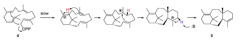 As an illustration, the single step conversion of the acyclic geranylgeranyl pyrophosphate (4) starting material into the complex tricyclic hydrocarbon taxadiene (5) catalyzed by was modeled. The starting points for this exercise were the crystal structure of taxadiene synthase from Pacific Yew in complex with Mg2+ and 2-fluorogeranylgeranyl diphosphate (PDB entry 3P5R; also see 3P5P) and the detailed mechanistic (labeling) and quantum mechanical studies on this fascinating conversion. As shown in the scheme below, ionization of 4 (loss of pyrophosphate) followed by a number of carbocation rearrangements and proton loss lead to 5. Effective model building must take into account an effective fit into the active site as well results from mechanistic labeling studies and the chemical reactivity of the substrate and reactive intermediates. As a model system, Rebexsess has built 3D models for this enzyme catalyzed reaction, consistent with experimental data and this model suggests the role of the enzyme in exerting conformational control of substrate folding, binding of carbocation intermediates and identification of the pyrophosphate leaving group as the base in the final deprotonation step in this sequence.