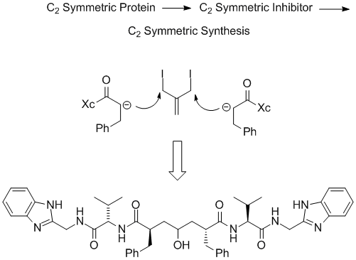 HIV-1 protease is a C2 symmetric aspartic protease whose first known inhibitor was the natural product pepstatin. A design approach that incorporated the hydroxyl group from pepstatin into the center of a symmetric capped peptidomimetic led to novel inhibitor design. Thus, the thought process went from a symmetric protein to a symmetric inhibitor class via a bi-directional synthesis. This concept was executed to produce potent enzyme inhibitors quickly with a very small chemistry group. (Exploratory medicinal chemistry group at Lederle Laboratories initiated by Martin F. Semmelhack)
